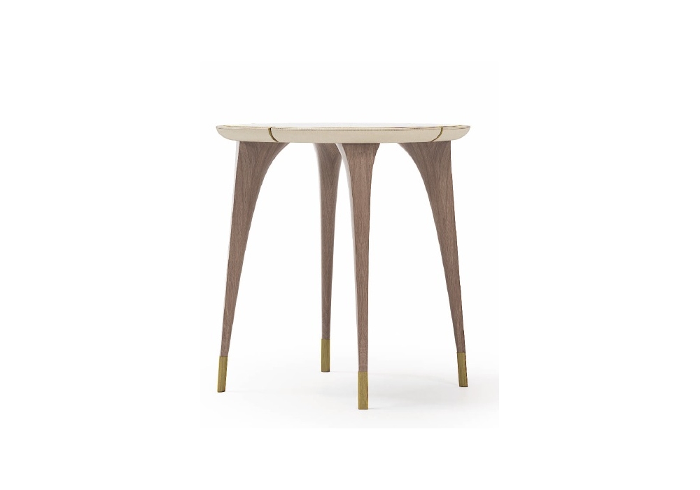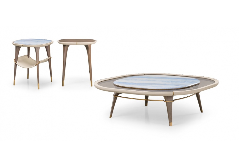 Melting Light conçue par Andrea Bonini pour Turri est une table d'appoint avec structure en MDF et noyer massif. Plateau en marbre ou bois en différentes finitions avec revêtement en cuir. Pièces métalliques en finition or brossé ou bronze. Disponible dans la version avec ou sans poche.