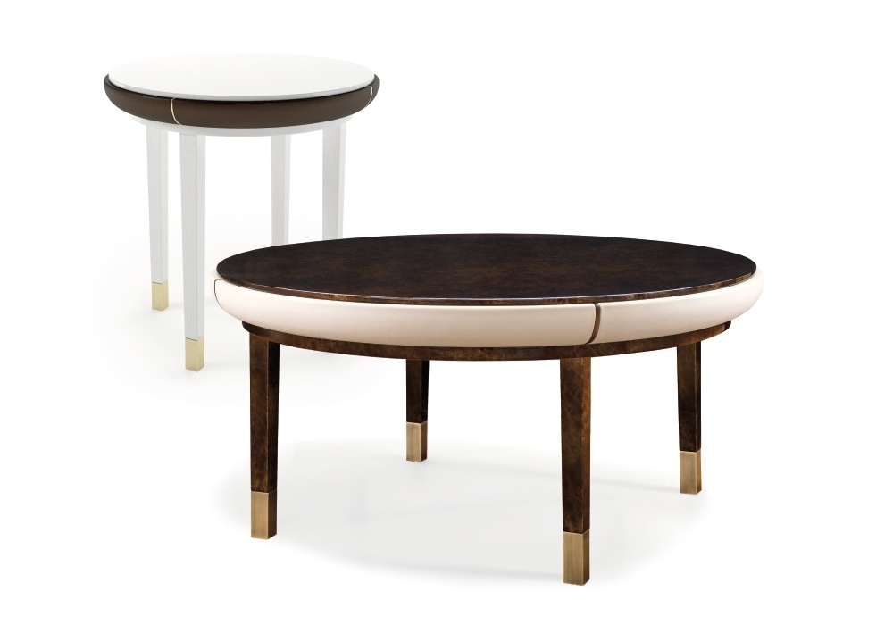 Noir conçue par Andrea Bonini pour Turri est une table d'appoint avec structure en MDF et bois massif avec finition polyester brillante décorée à la main. Plateau en marbre ou bois recouvert de différents cuirs. Pièces métalliques en finition or clair ou bronze.
