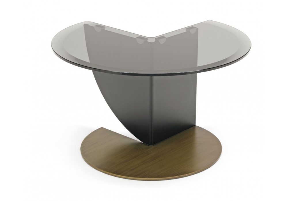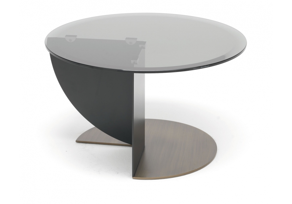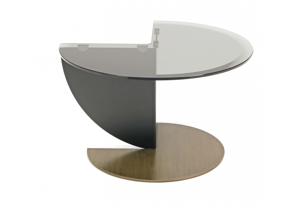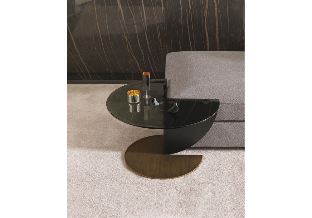 Rialto conçue par MisuraEmme est une table basse avec structure composée de cercles et de demi-cercles en métal, caractérisée par la base en finition peinte en laiton vieilli et peinte en noir. Le dessus en verre peut être 100% cercle complet ou 3/4 cercle.