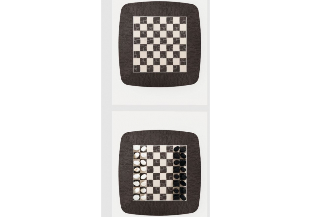 Spark Game conçue et produite par Giorgetti est une table basse avec structure en aluminium peint finition Étain et frêne gris anthracite, et plateau en acajou sapelli gris anthracite et érable sycomore. Disponible avec incrustation de damier ou de backgammon.