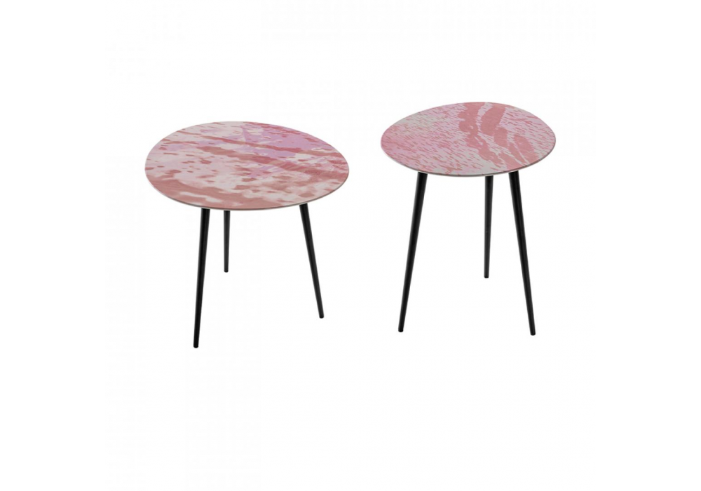 Suitable RS conçue par Lia Bosch, Peintre pour Casamilano est une table d'appoint avec plateau en MDF décoré avec impression numérique et base en métal peint en noir.