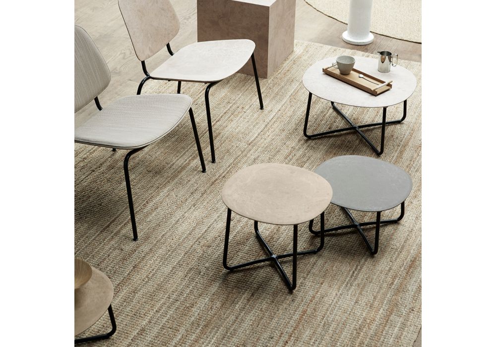 Lily conçue par OEO Studio pour Mater est une table basse avec plateau en Matek®, en différentes finitions, pieds en tube d'acier finition noire. Disponible en deux hauteurs.