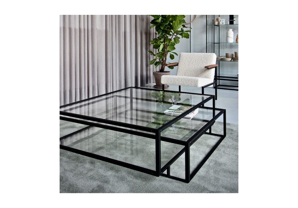Tangled Square conçue par Carolina Wilcke pour Spectrum est une table basse carrée avec 3 étagères et structure en acier, enduit de poudre noir ou taupe. Verre (4 mm) disponible en 2 différentes finitions: clair ou fumé.