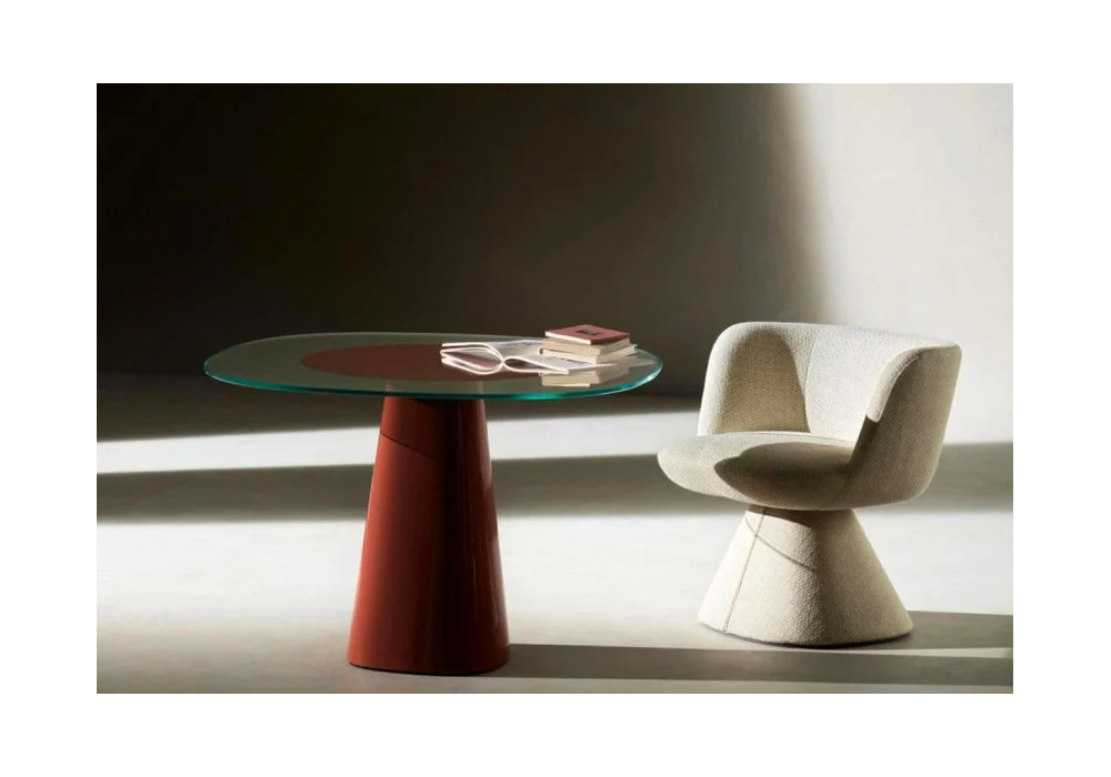 Allure O' Dot Vetro conçue par Monica Armani pour B&B Italia est une table basse ronde en fibre de bois peinte brillante avec un plateau en verre sérigraphié.