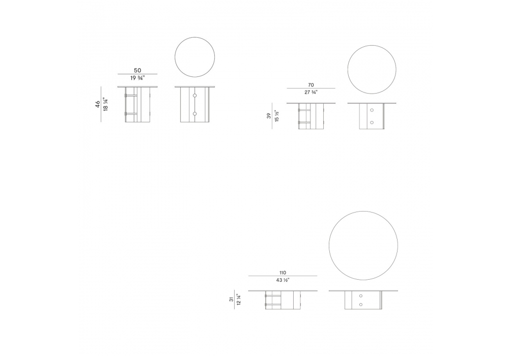 | Dimensions | Ø 50 x H 46 cm; Ø 70 x H 39 cm; Ø 110 x H 31 cm |
