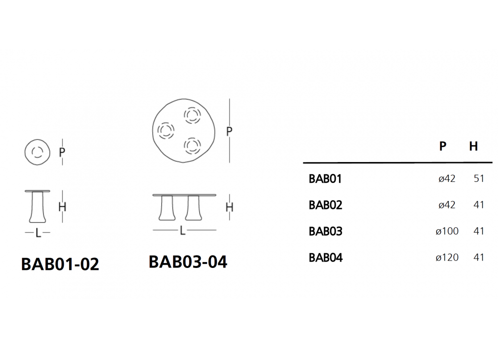 | Dimensions | BAB01_ Ø 42 x H 51 cm; BAB02_ Ø 42 x H 41 cm; BAB03_ Ø 100 x H 41 cm; BAB04; Ø 120 x H 41 cm. |