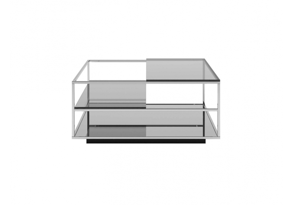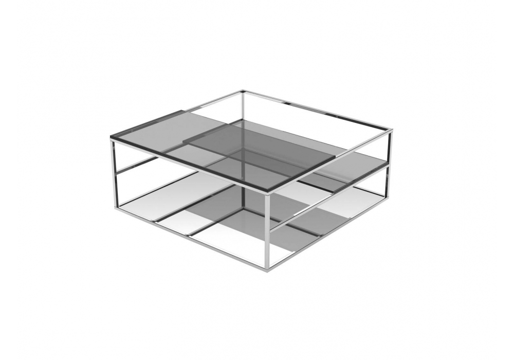 Floe conçue par Daisuke Kitagawa pour Cappellini est une table basse avec structure en métal, base fixe avec finition miroir et étagères en verre pouvant être positionnées librement.