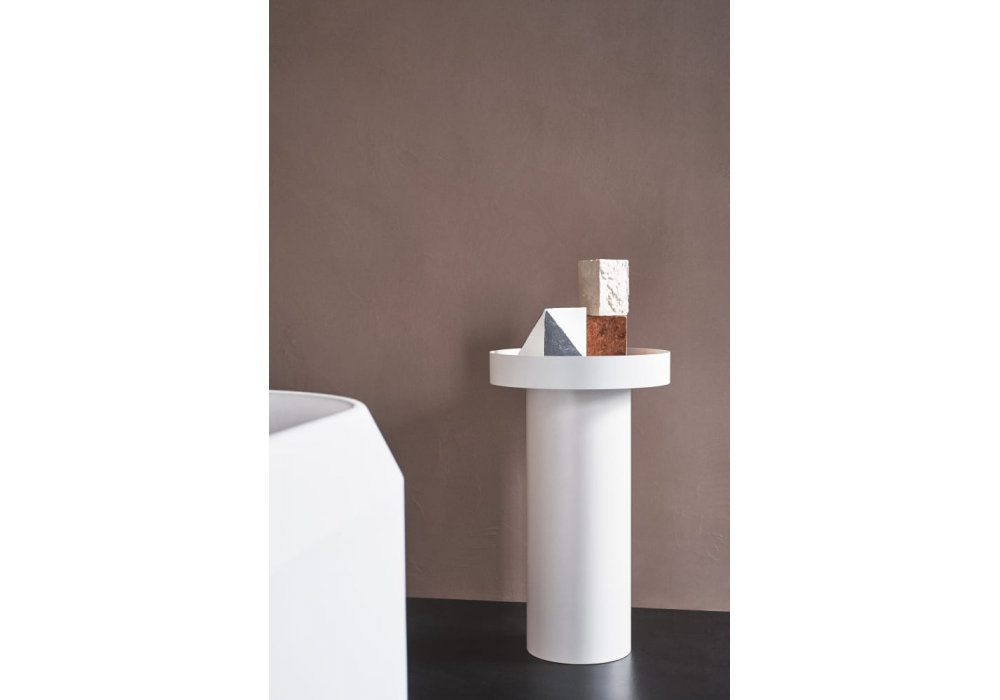 Gemma, conçue par Sebastian Herkner pour Agape, est une petite table avec plateau en acier inoxydable avec finition satinée ou brunie brossée. La structure, qui fait également office de récipient, est réalisée en contreplaqué de bouleau courbé, avec un revêtement extérieur en chêne naturel, marron ou foncé ou laqué blanc ou gris. La partie interne est toujours recouverte de papier mélaminé gris clair. Le plateau de la table basse est également disponible avec une bande extérieure laquée en blanc mat.