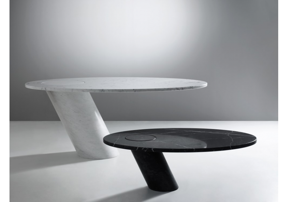 Eccentrico conçue par Angelo Mangiarotti pour Agapecasa, est une table basse en marbre de forme elliptique avec un pied central incliné. Le marbre est disponible dans les finitions suivantes : blanc Carrara, noir Marquinia, gris Carnico, vert Alpi et Emperador Dark.