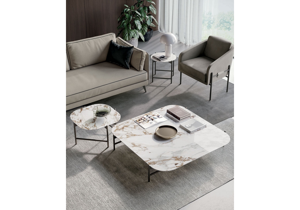 Supernova conçue par Signorotto+Partners pour Dall'Agnese est une table basse réalisée avec un plateau en bois ou en grès associé à un panneau en bois laqué mat. Base en métal. Disponible en différentes finitions et dimensions.