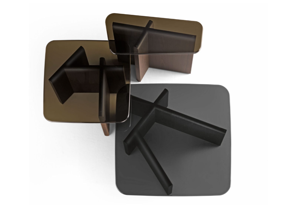 Type conçue par Patrick Norguet pour Fiam, est une table basse avec plateau en verre stratifié finition bronze ou fumé. Structure en bois massif de la même couleur que le plateau (tabac ou noir).