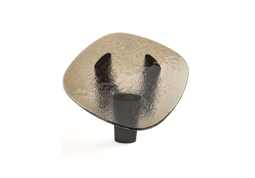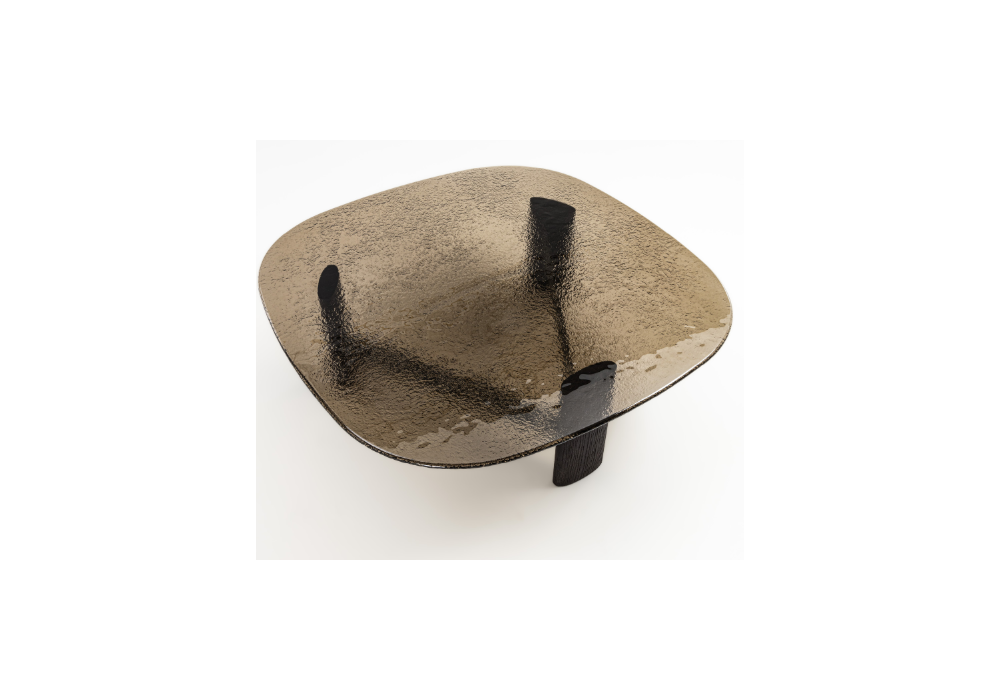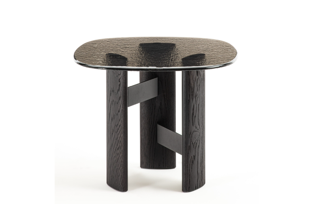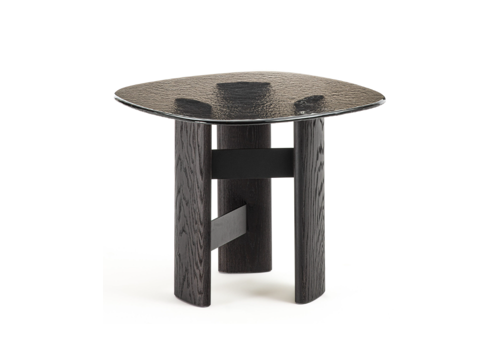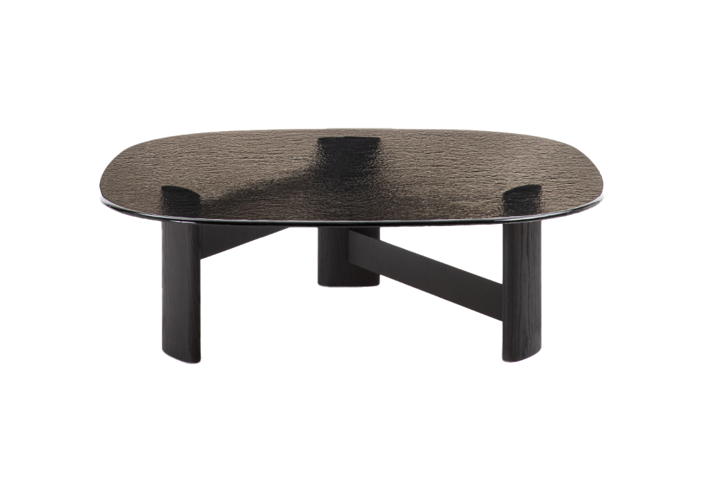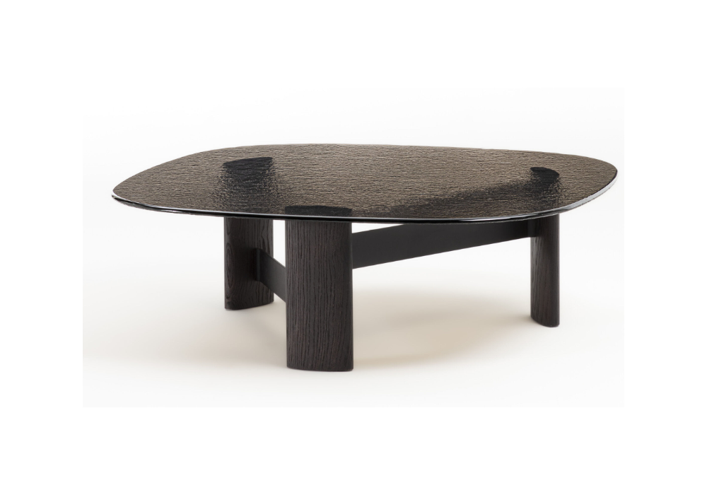 Latch conçue par Meneghello Paolelli pour Porada est une table basse dotée d'une structure en frêne massif brossé et de traverses de liaison en métal noir mat brossé. Le plateau est en verre thermoformé finition Terre.