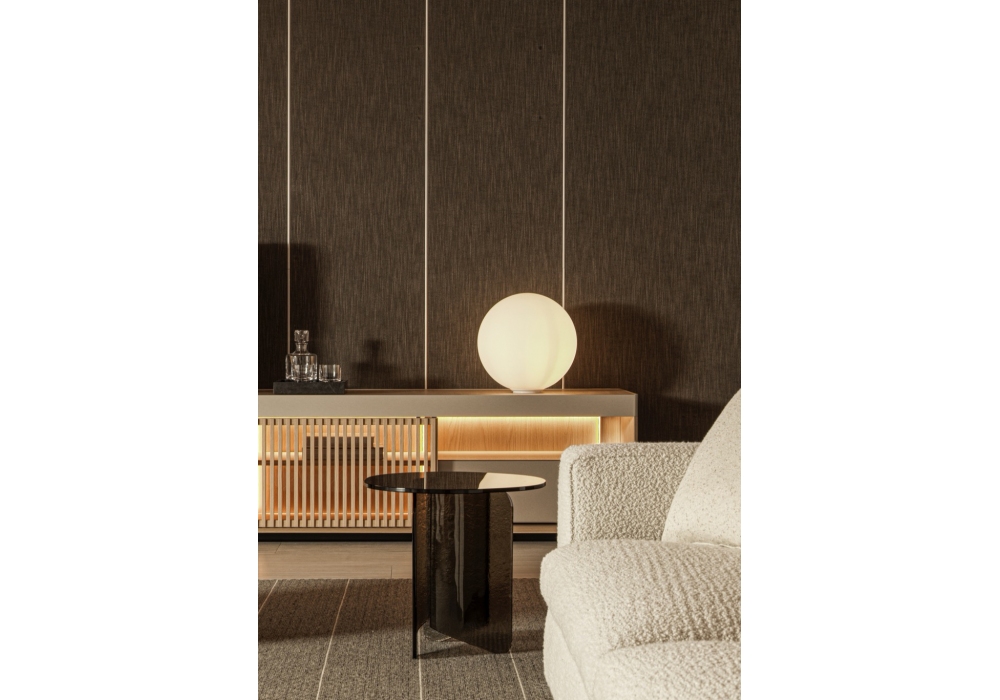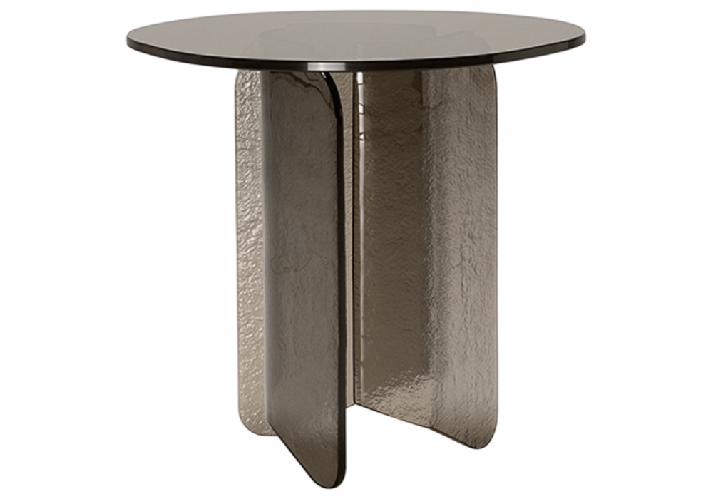Fleur conçue par Christophe Delcourt pour Molteni&C est une table d'appoint au plateau rond en verre bronzé, reposant sur trois pieds courbés disposés concentriquement, évoquant les pétales d'une fleur.