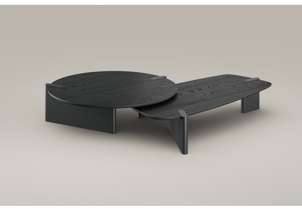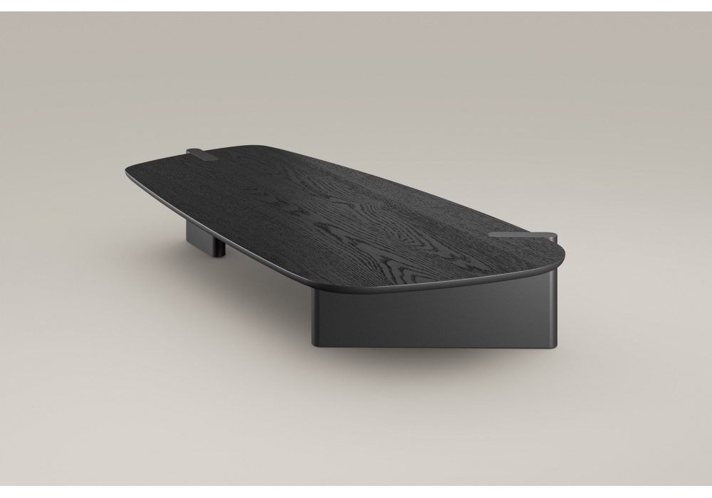 Flatiron conçue par Mauro Lipparini pour Bonald, est une table basse avec plateau en placage de noyer ou de chêne. L'insert et le piètement sont en finition plomb ou bronze assortie au plateau.