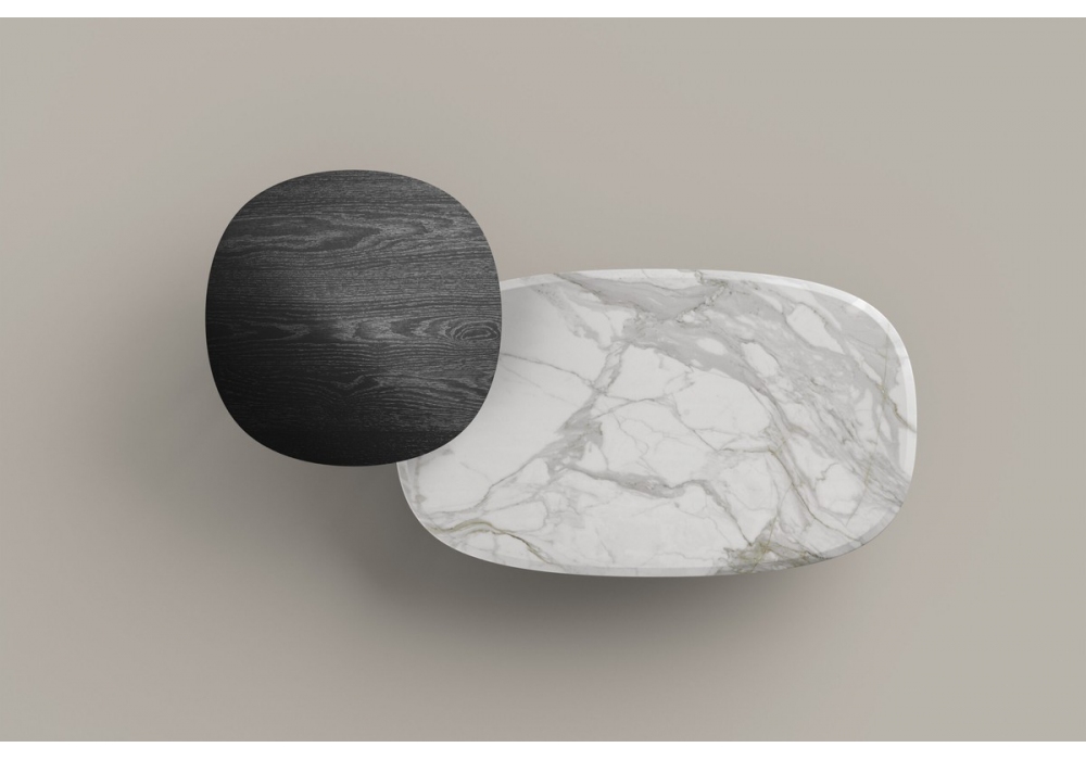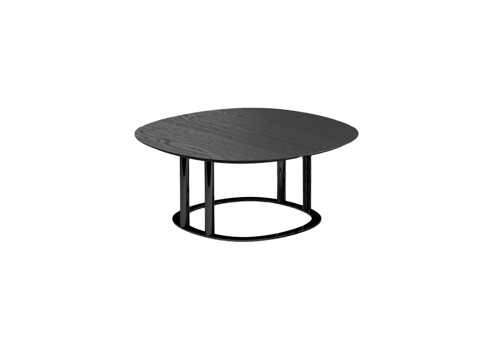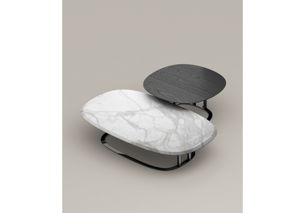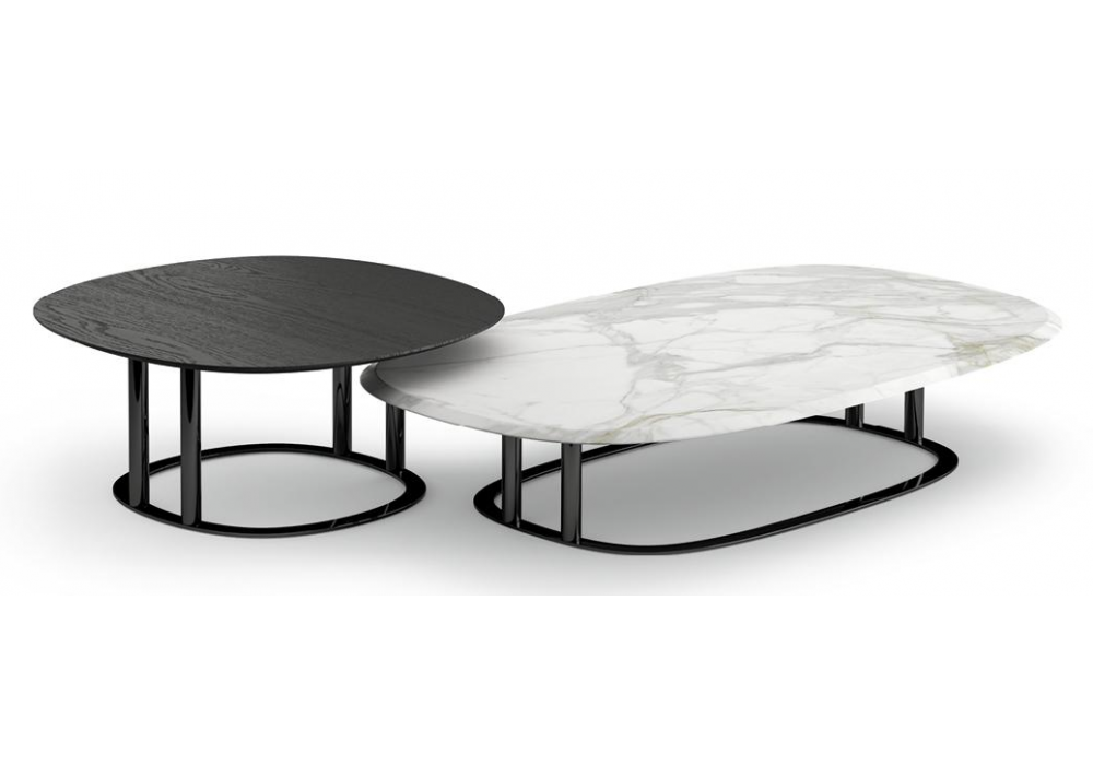 Isabey conçue par Gabriele et Oscar Buratti pour Bonaldo est une table basse avec une base en métal et un plateau en verre, marbre ou bois dans différentes finitions.