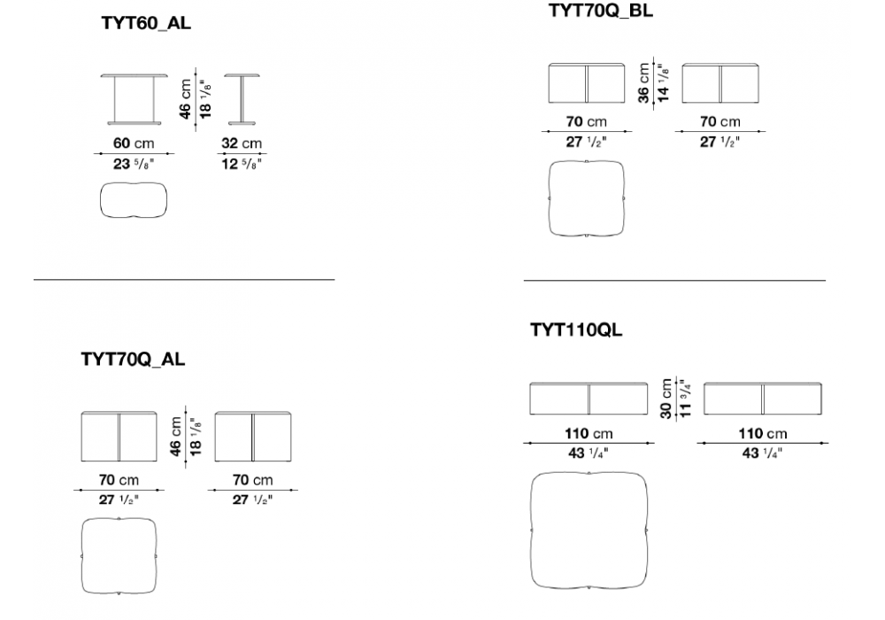 | Dimensions | 60 x 32 x H 46 cm; 70 x 70 x H 46 cm; 70 x 70 x H 36 cm; 110 x 110 x H 30 cm. |