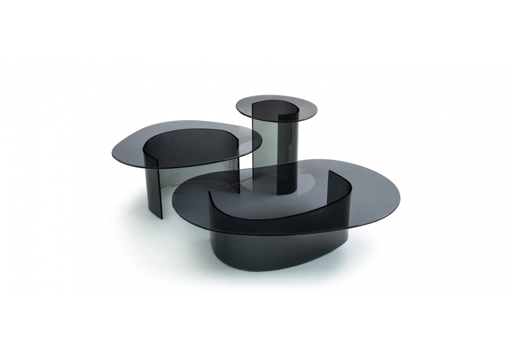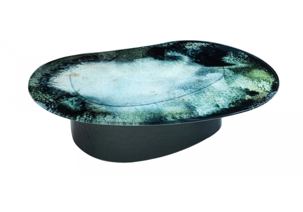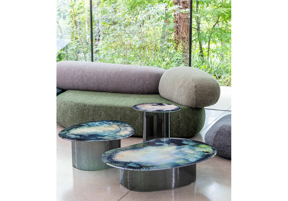 Lakelet conçue par Front pour Moroso est une table basse en verre trempé disponible en différentes finitions et tailles.