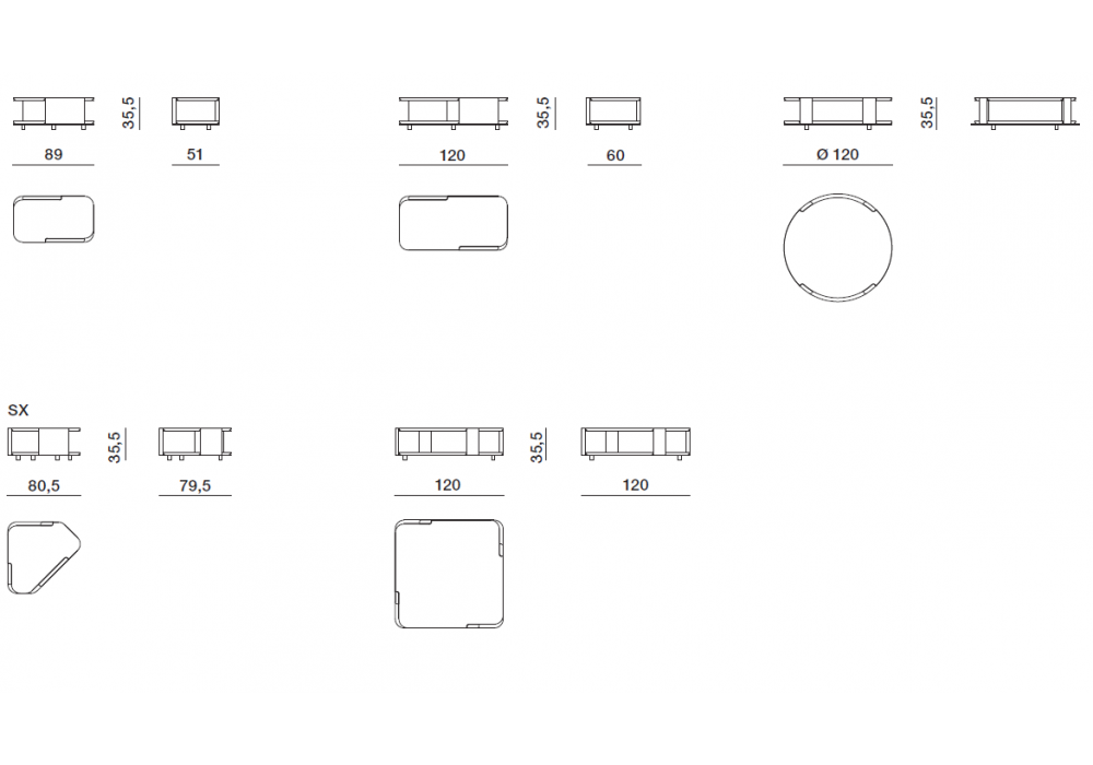 | Dimensions | 89 x 51 x H 35.5 cm; 120 x 60 x H 35.5 cm; Ø 120 x H 35.5 cm; 80.5 x 79.5 x H 35.5 cm; 120 x 120 x H 35.5 cm. |