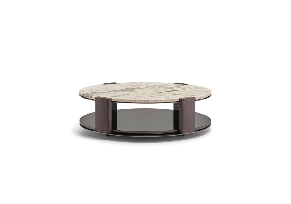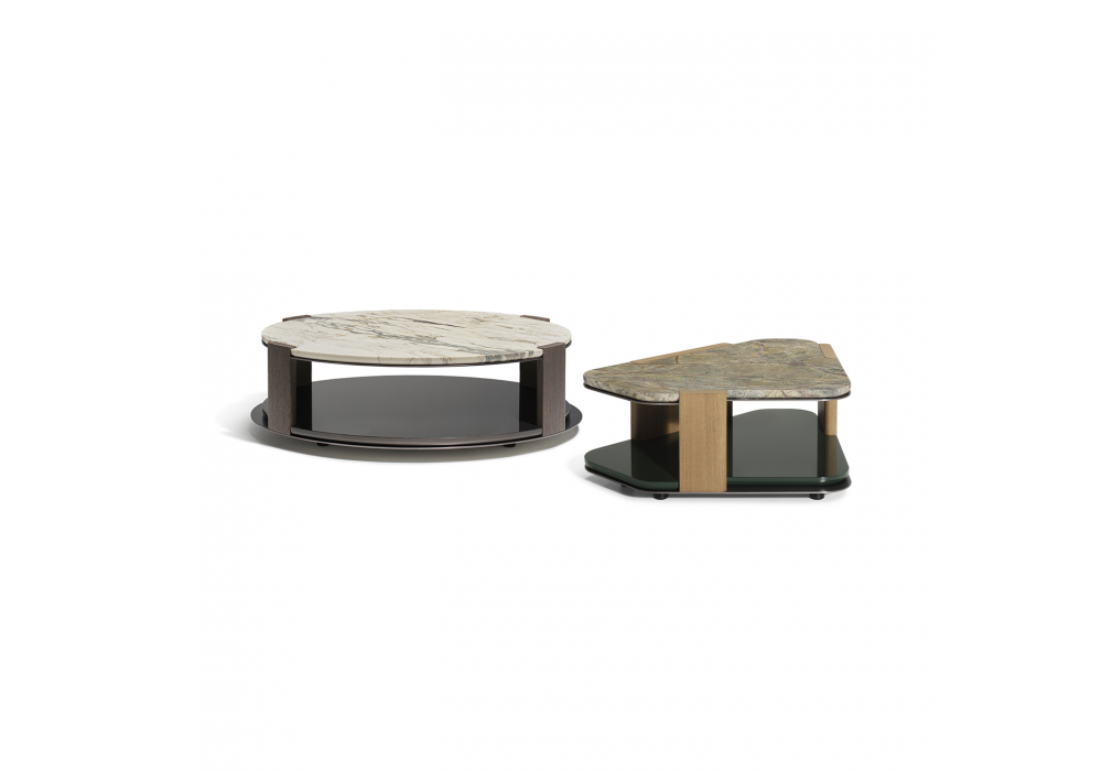 Jeanne conçue par Christophe Delcourt pour Molteni&C est une table basse dotée d'une structure en aluminium peint et d'inserts en frêne massif teinté. Le double plateau est disponible en pierre avec un traitement hydrofuge et antitache, ou en MDF laqué brillant. Les plateaux inférieurs sont uniquement disponibles en laque brillante. Les pieds sont en aluminium peint avec embouts antidérapants.