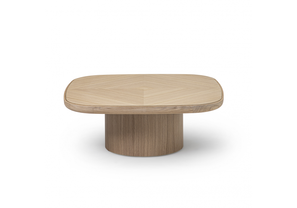 Enook conçue par Maurizio Marconato et Terry Zappa pour Porada est une table basse avec un piètement incurvé en contreplaqué et une structure en chêne massif. Son plateau en chêne est orné d'une marqueterie radiale.