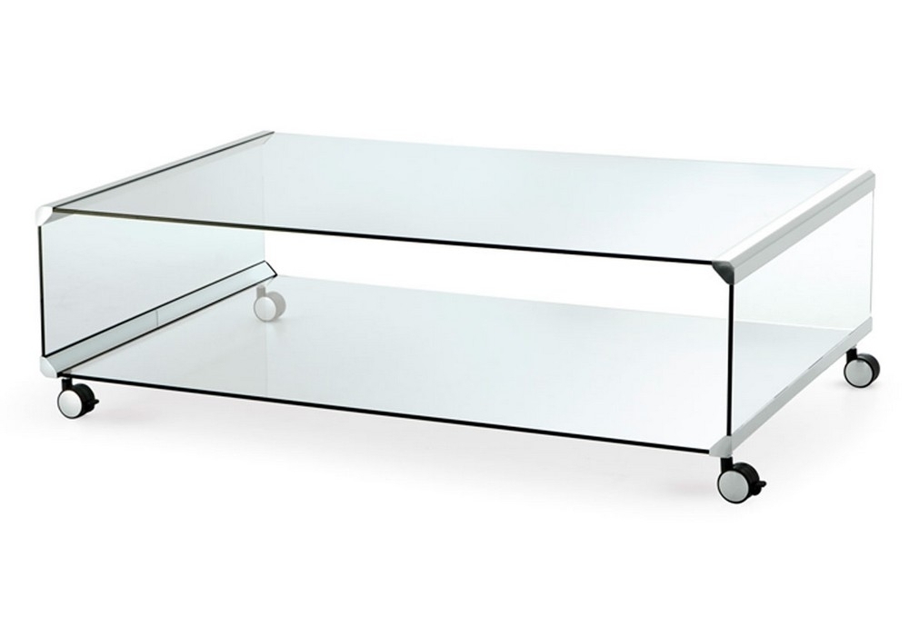 George 2 conçue par Pierangelo Gallotti pour Gallotti&Radice est une table basse sur roulettes en verre transparent ou “grigio Italia” fumé trempé de 8mm d’épaisseur. Parties métalliques en acier inox brillant. Sur demande acier inox satiné, laiton brillant, satiné ou laqué blanc ou noir gaufré. Disponible version sans roulettes (hauteur totale: 34cm).