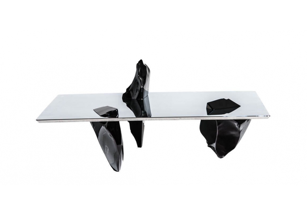 Sereno conçue par Fredrikson Stallard pour Driade est une table basse sculpture avec finition métallique réalisée à l'aide de la technologie Sputtering en titane et or. Plateau en particules de bois de 18 mm d'épaisseur. recouvert d'une épaisse feuille d'acier inoxydable poli miroir. Usage interne uniquement.