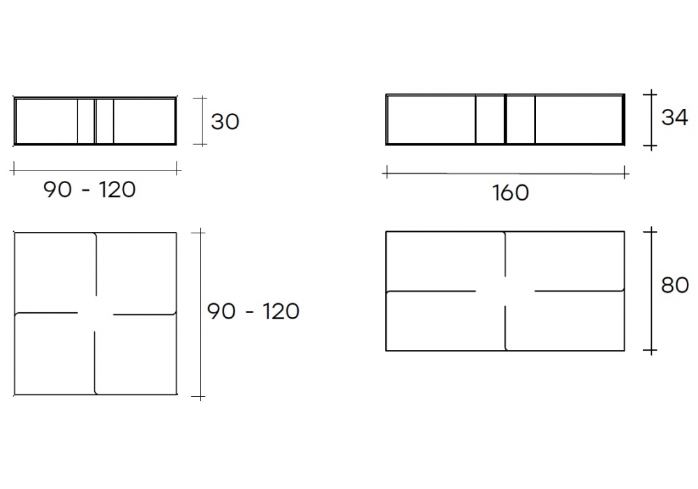| Dimensions | 90 x 90 x H 30 cm; 120 x 120 x H 30 cm; 160 x 80 x H 34 cm. |