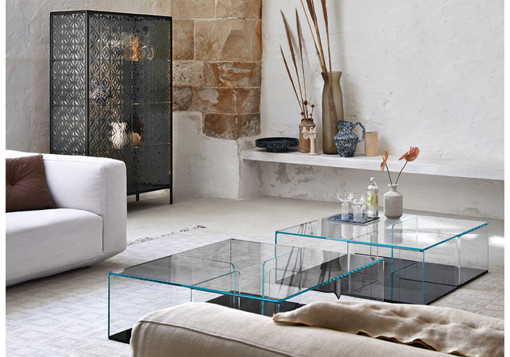 Quadra conçue par Matteo Nunziati pour Fiam est une table basse de rangement constituée de 4 éléments en verre cintré de 10 mm interposés entre 2 plateaux en verre de 10 mm. Plateau supérieur et cloisons en verre extralight transparent; bases dans les variantes suivantes: verre extralight transparent, verre extralight verni dessous blanc, verre extralight verni dessous noir, verre extralight argenté et verre bronze argenté.