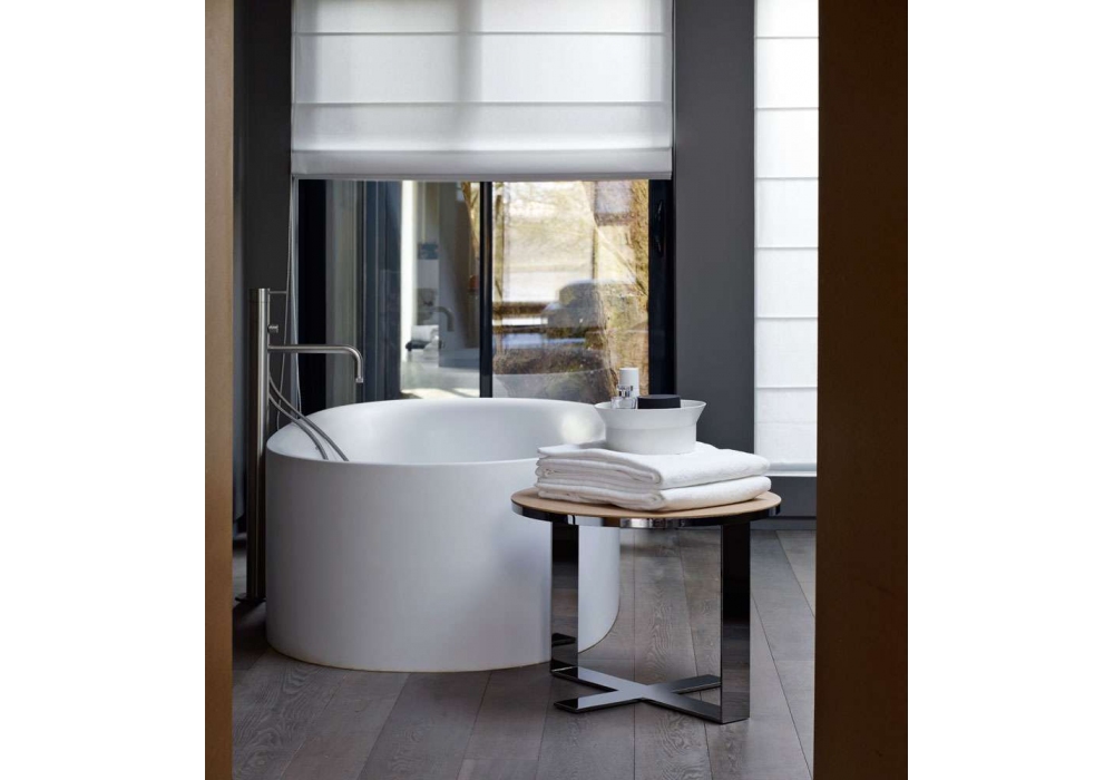 Eileen conçue par Antonio Citterio pour B&B Italia est une table avec un plateau arrondi (bois ou laqué ou marbre, au choix), et le profil de la base avec sa forme en croix. Ils sont l'expression d'une esthétique raffinée qui se marie bien avec d'autres produits.