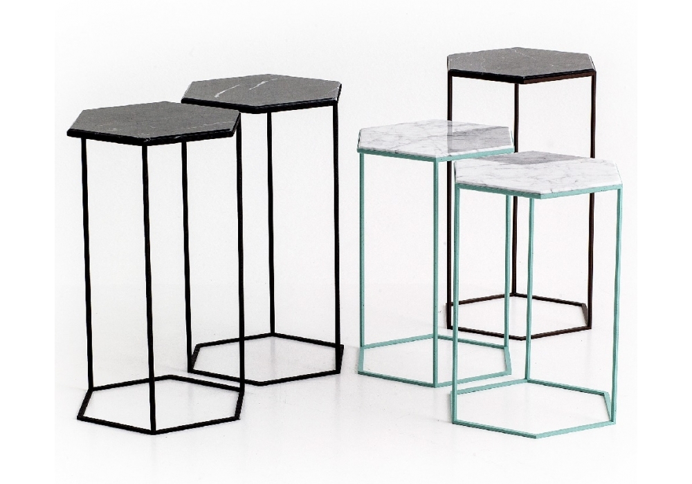 A perfect little side companion. The Hexxed table completes the 2014 metal collection which focuses on clean lines, nice details like the hexagon tubing and special finishes. Coming in 2 heights and three color combinations. The powder coated Vintage Copper, Polished Copper and Matt Black are finish with white or black marble tops. Combining the tables in a honeycomb fashion creates an endless coffee table that can even rise and drop when used with the two heights.