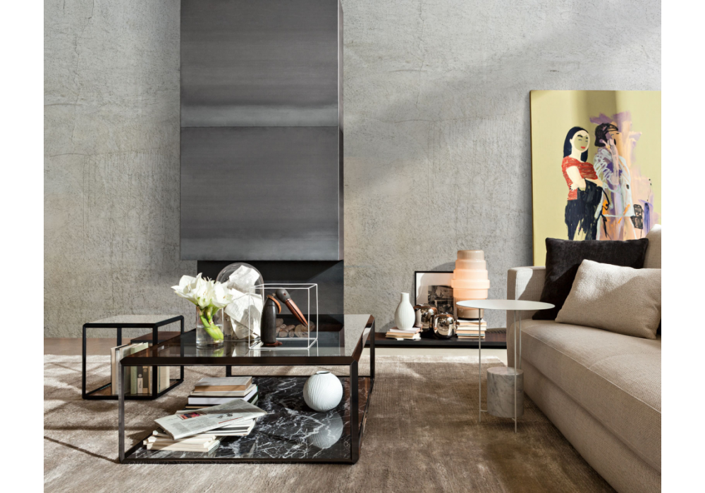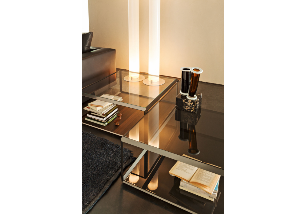 45° conçue par Ron Gilad pour Molteni&C est une table basse réalisée avec structure en métal ou en bois, plateau supérieur en verre et plateau inférieur en marbre ou verre. Disponible en différentes finitions et dimensions.