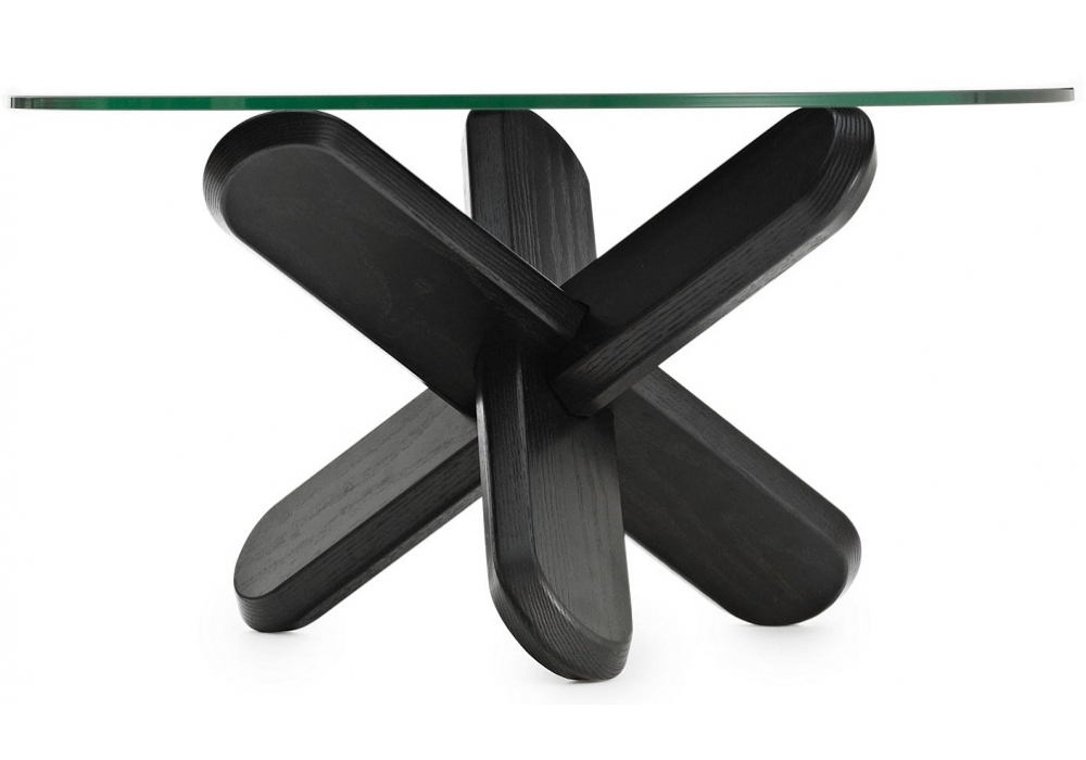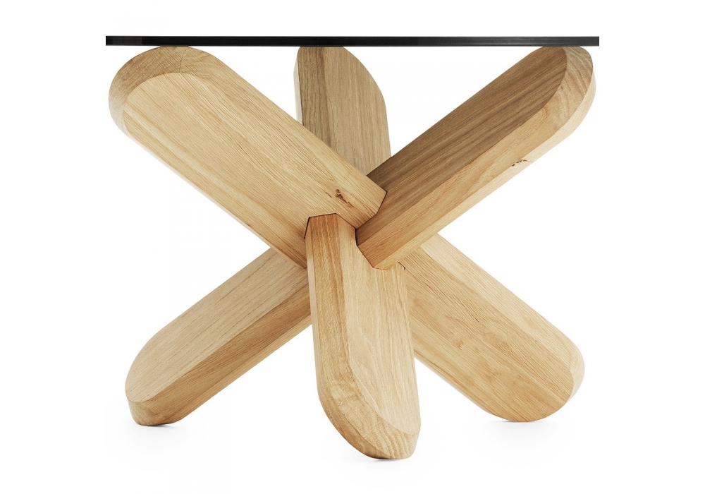 Ding conçue par Rudolph Schelling Webermann pour Normann Copenhagen est une table basse, structurée par trois planches de bois de chêne entrecroisées, avec un plateau circulaire en verre transparent ou fumé. Ding est disponible en différentes finitions de bois.