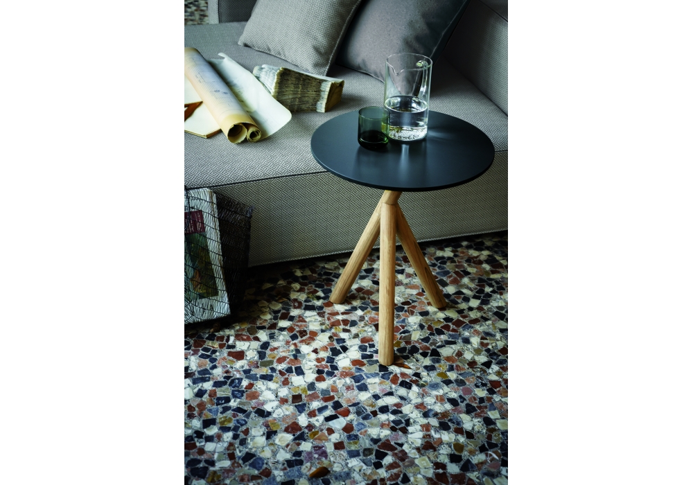 Stork conçue par Gordon Guillaumier pour Roda est une petite table d'extérieur composée d'une base en teck et d'un plateau en grès.