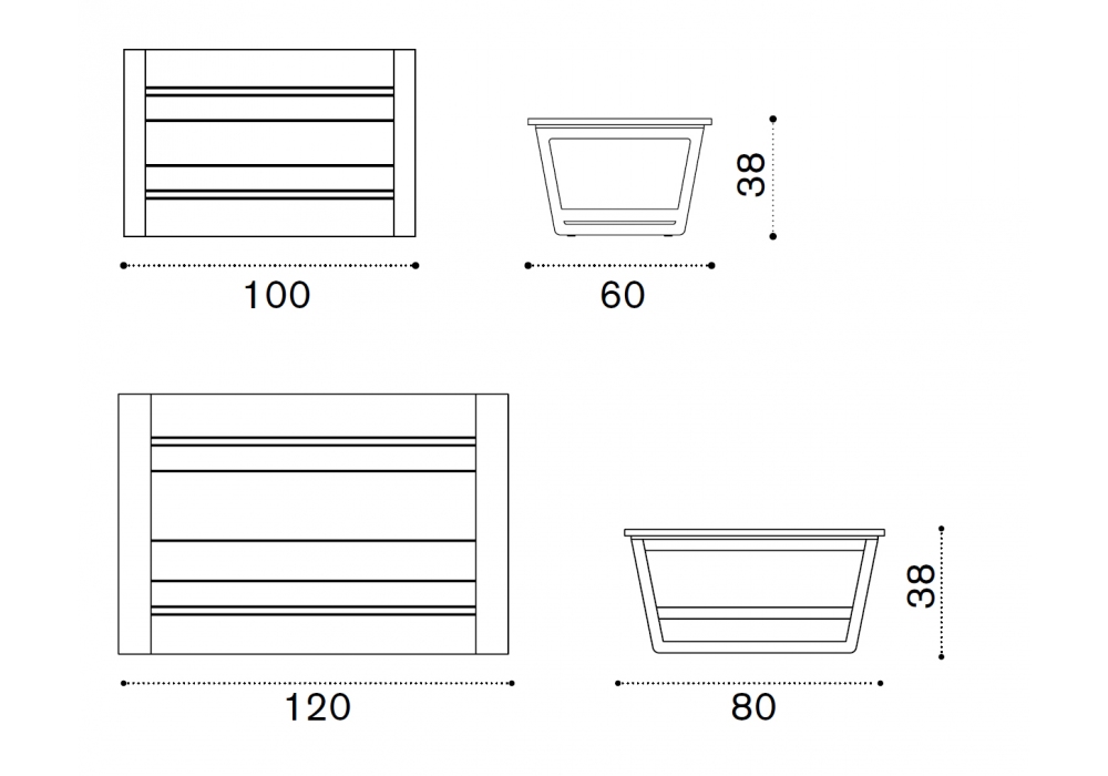 | Dimensions | 100 x 60 x H 38 cm; 120 x 80 x H 38 cm. |