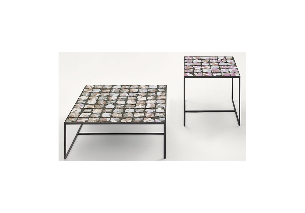 Sciara conçue par Marella Ferrera pour Paola Lenti est une belle table d'appoint avec structure en acier inox Délabré. Le plateau, décoré à la main, est composé de carreaux de pierre de lave avec décor en verre, disponible en 7 différentes finitions. Également disponible en 2 dimensions. Ce produit peut être utilisé aussi dans les environnements intérieurs.