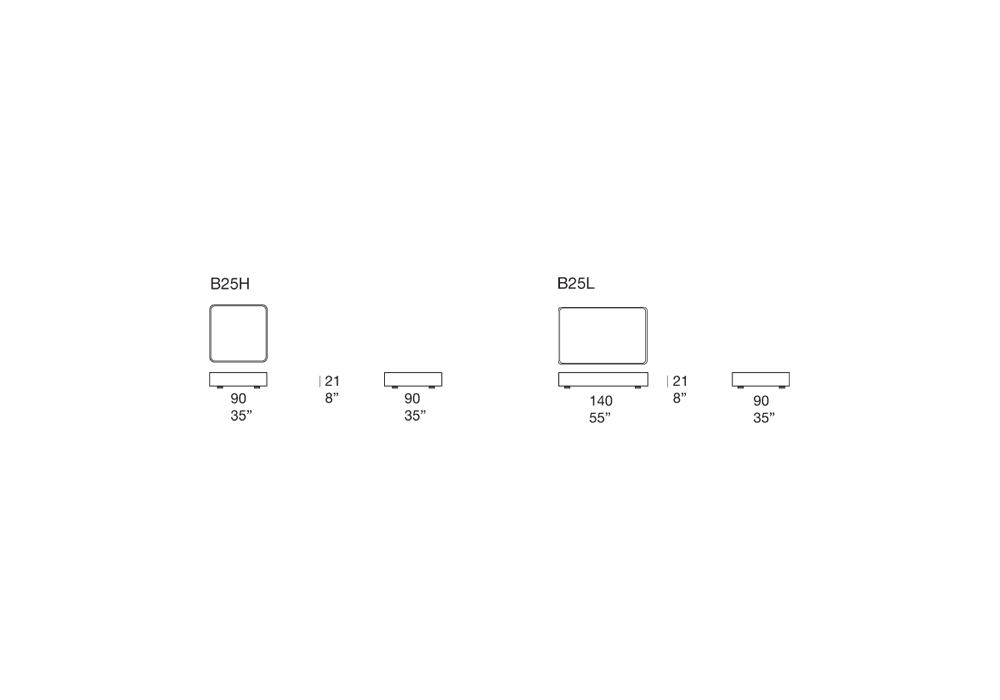 | Dimensions | 90 x 90 x H 21 cm (B25H); 140 x 90 x H 21 cm (B25L). |