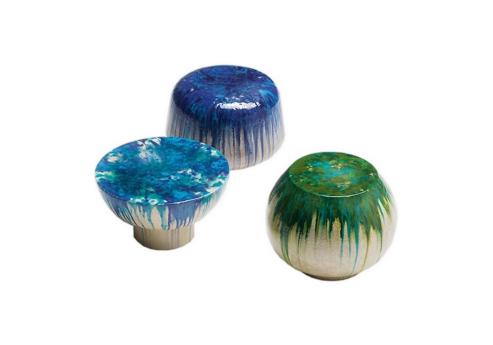 I Calatini conçue par Marco Merendi pour Paola Lenti est une table basse avec structure en céramique, disponible en différents modèles et dimensions, décorée en blanc ou en couleur. La décoration de la table est faite à la main par le maître Nicolò Morales, ce processus rend chaque pièce unique.