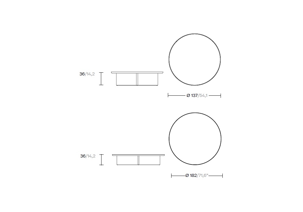 Dimensions Ø 137 x H 36 cm; Ø 182 x H 36 cm.