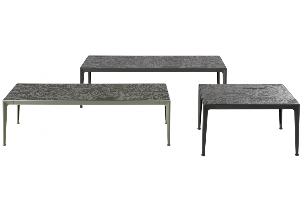 Mirto conçue par Antonio Citterio pour B & B Italia Outdoor est une table basse en aluminium moulé sous pression peint. Plateau en pierre de lave émaillée avec une décoration dans les couleurs suivantes: anthracite, argile et sauge. Disponible en plusieurs dimensions.