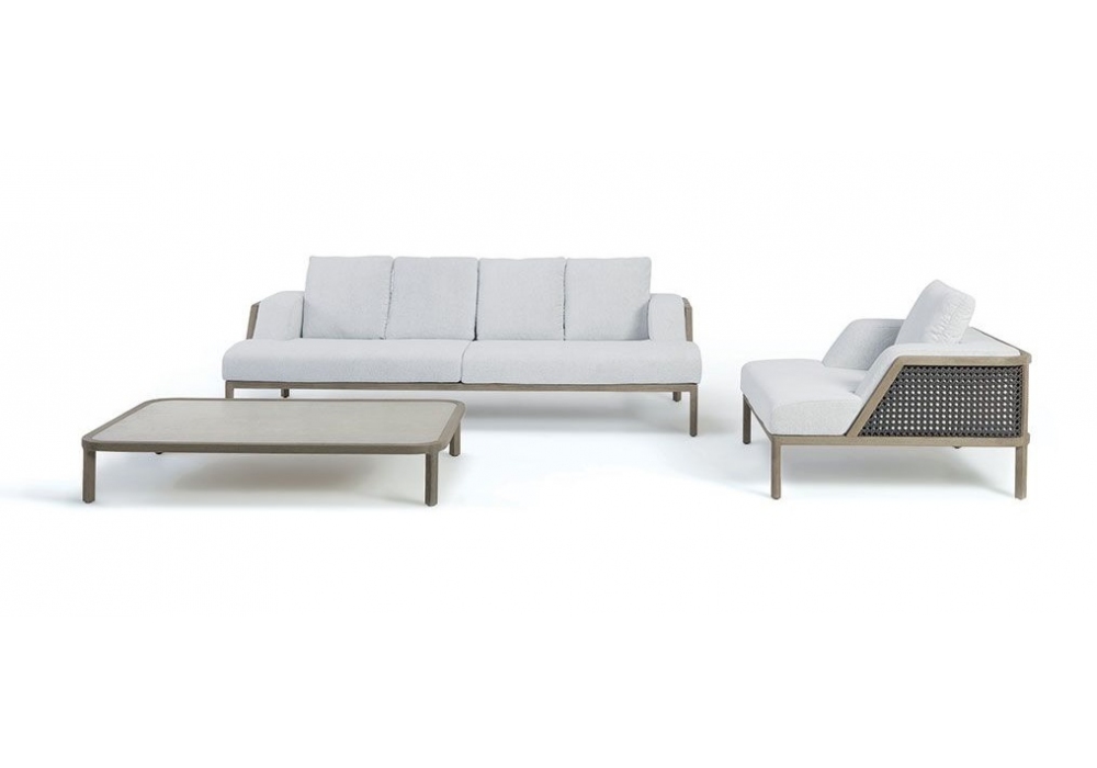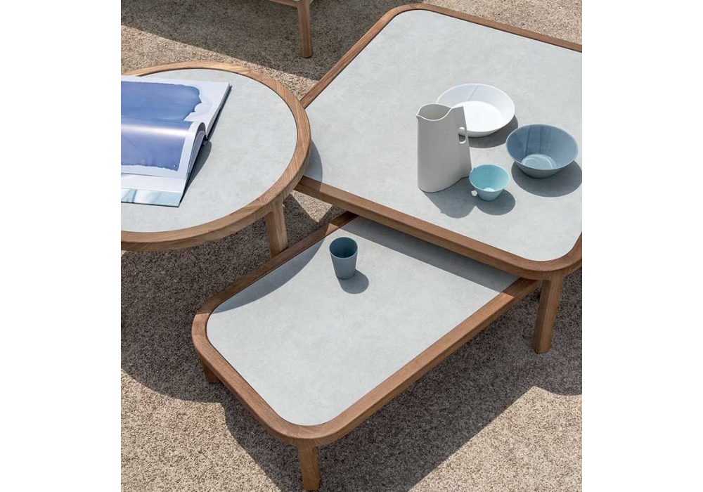 Grand Life conçue par Christophe Pillet pour Ethimo est une table basse avec structure en teck et plateau en pierre céramique. Grand Life est disponible en différentes finitions et tailles.