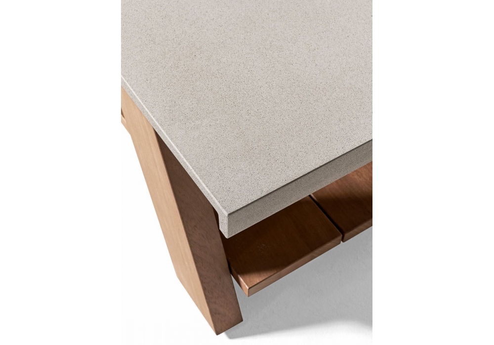 Joi Open Air conçu par Andrea Parisio pour Meridiani est une collection de tables d'extérieur avec structure en iroko massif avec vernis protecteur et plateau en UHPC renforcé de fibres en finition gris clair avec traitement de protection étanche à l'eau.