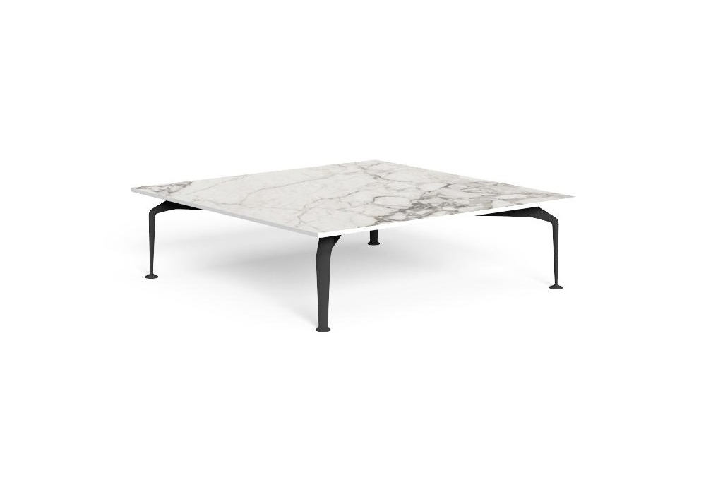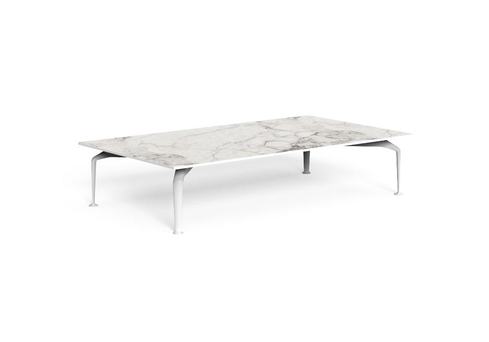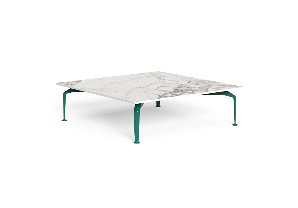 Cruise Alu conçue par Ludovica et Roberto Palomba pour Talenti est une table basse avec structure en aluminium en trois finitions, blanc, graphite ou vert aqua et plateau en grès dans la finition calacatta 12 mm.