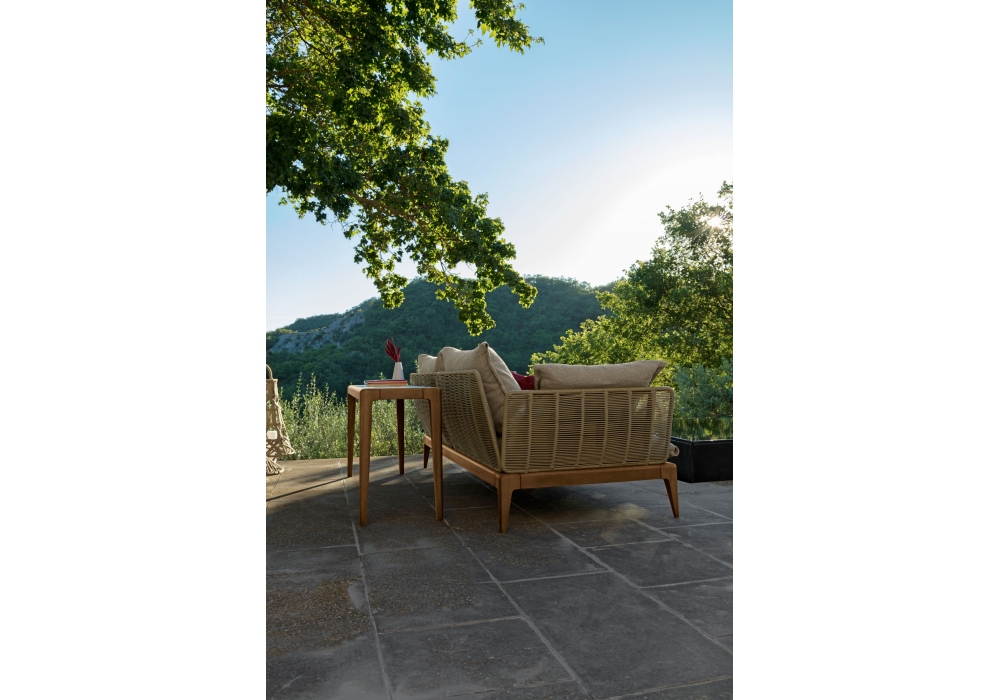 Cruise Teak conçue par Ludovica et Roberto Palomba pour Talenti est une console avec structure en bois et plateau en grès, disponible en différentes finitions.