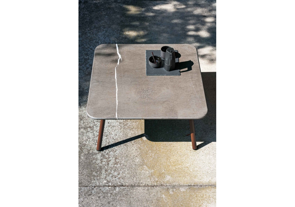 Piper conçue par Rodolfo Dordoni pour Roda est une table basse en aluminium peint en poudre avec plateau en hpl, teck ou pierre. Il est disponible en différentes tailles et finitions.