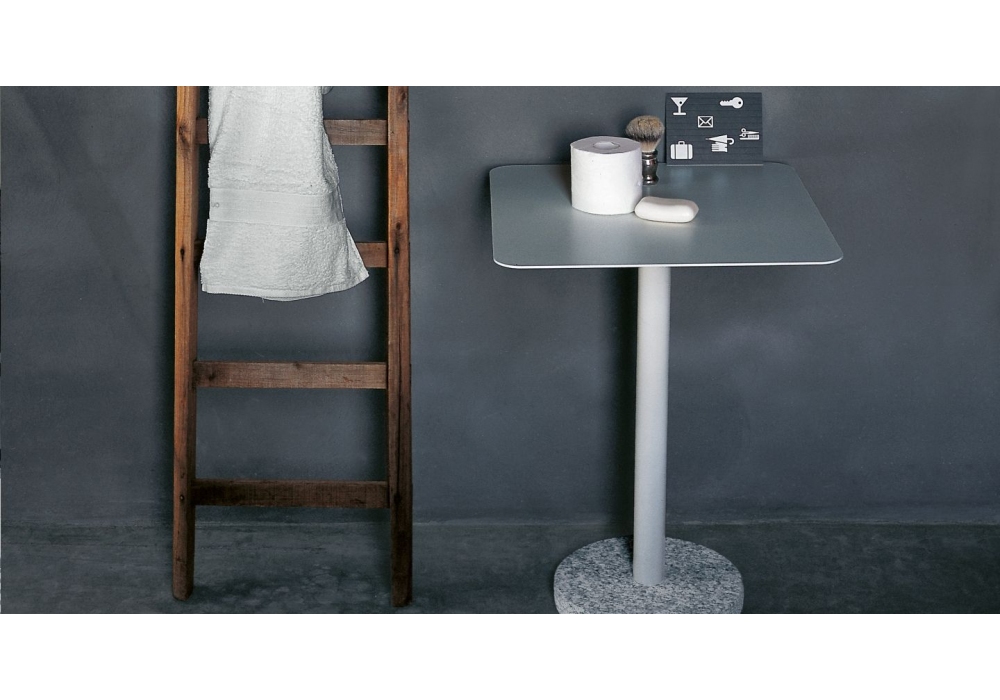 Bernardo conçue par Rodolfo Dordoni pour Roda est une table d'appoint d'extérieur composée d'une structure en acier inoxydable enduit de poudre, base en pierre et acier inoxydable enduit de poudre (uniquement pour les plateaux de table carrés) ou plateau en HPL.