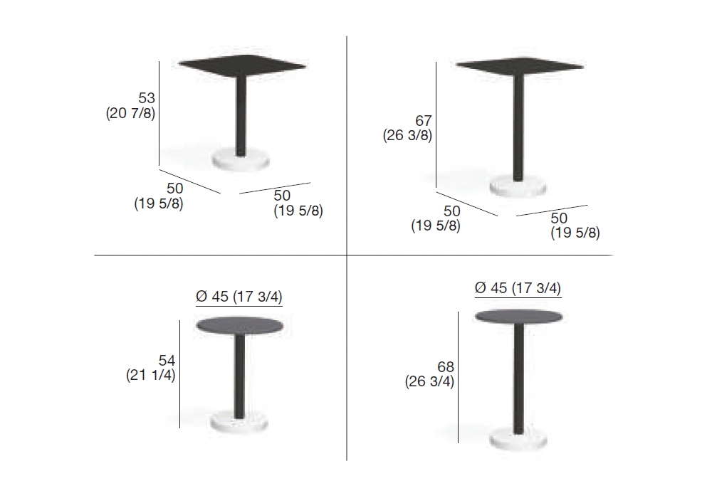 | Dimensions | • 50 x 50 x H 53 cm; • 50 x 50 x H 67 cm; • Ø 45 x H 54 cm; •Ø 45 x H 68 cm |