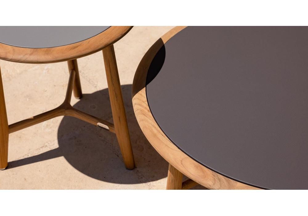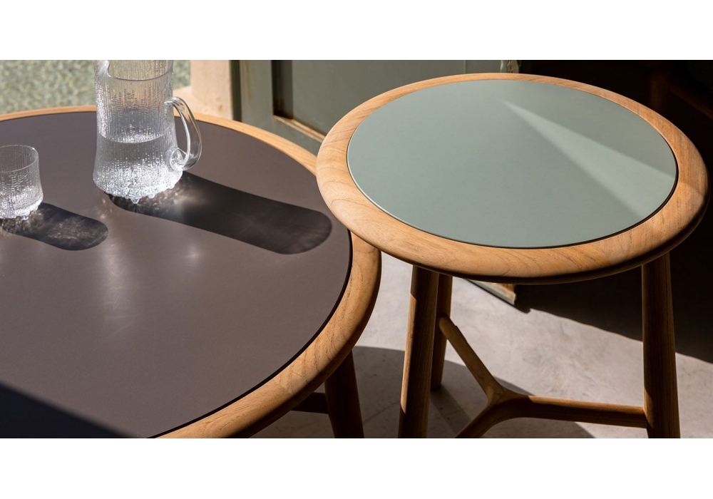 The Secret Garden conçue par Roberto Lazzeroni pour Poltrona Frau est une table basse entièrement réalisée en bois de teck massif finition naturelle, avec les pieds qui se terminent par un embout en acier inoxydable poli avec extrémité en nylon noir. Disponibles en 2 dimensions et hauteurs, avec un plateau en grès émaillé fini à la main.