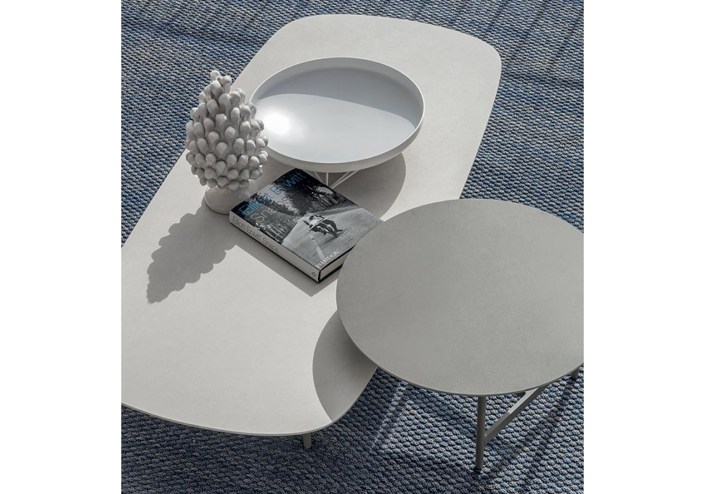 Calipso conçue par Ilaria Marelli pour Ethimo est une table basse avec structure en aluminium peint et plateau en pierre céramique. Calipso est disponible en différentes finitions et tailles.