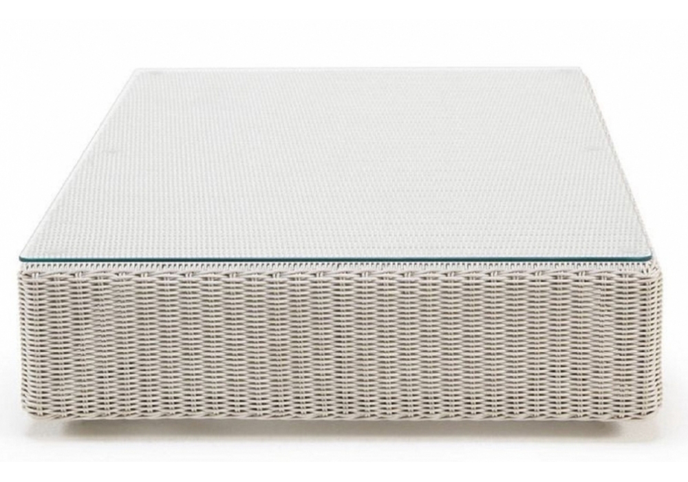 Cube produit et signé par Ethimo est une table basse quadrangulaire structurée par une coque en fibre d'Etwick tressée et un plateau en verre. Cube est disponible en différentes tailles et finitions.