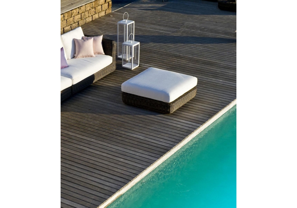 Agorà produit et signé par Unopiù est une table basse/pouf de forme quadrangulaire avec structure en aluminium et coque en fibre synthétique waprolace tissée à la main. Les coussins sont recouverts de tissu acrylique de différentes couleurs. Agorà est disponible en différentes finitions.